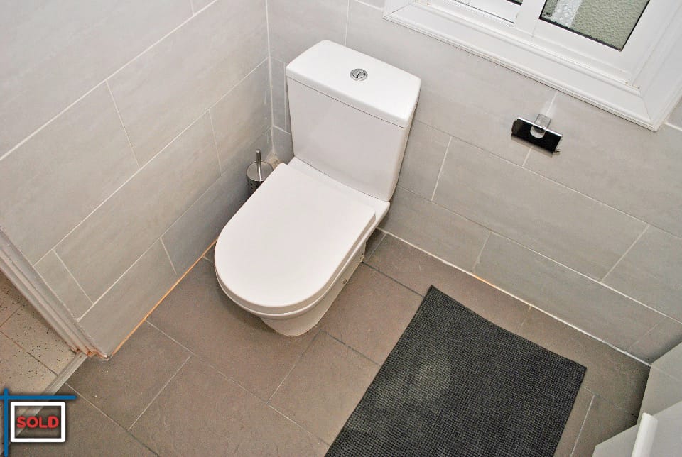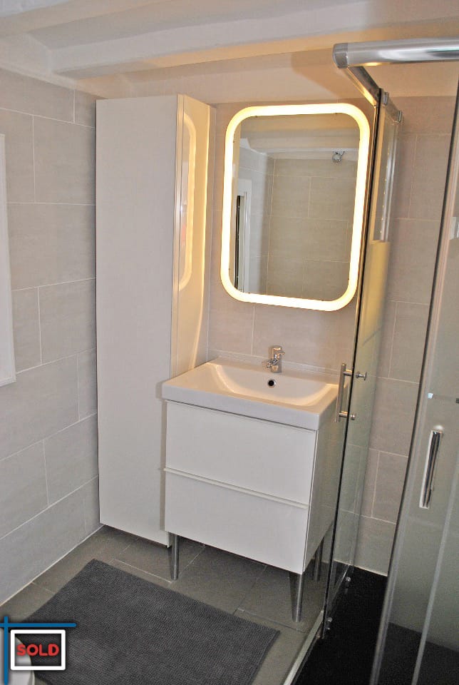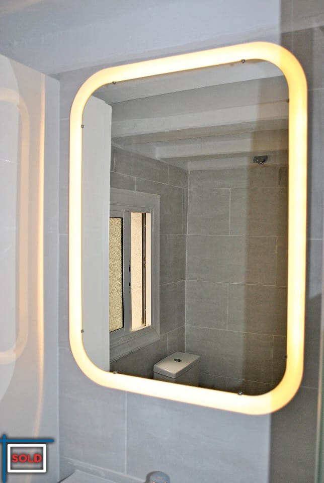 The bathroom has a big and modern with an enclosed shower, a toiled with a slow/cushioned closing toilet lid, a wide sink with storage space, mirror with led lighting and a big cabinet with shelves for the towels and bath products.